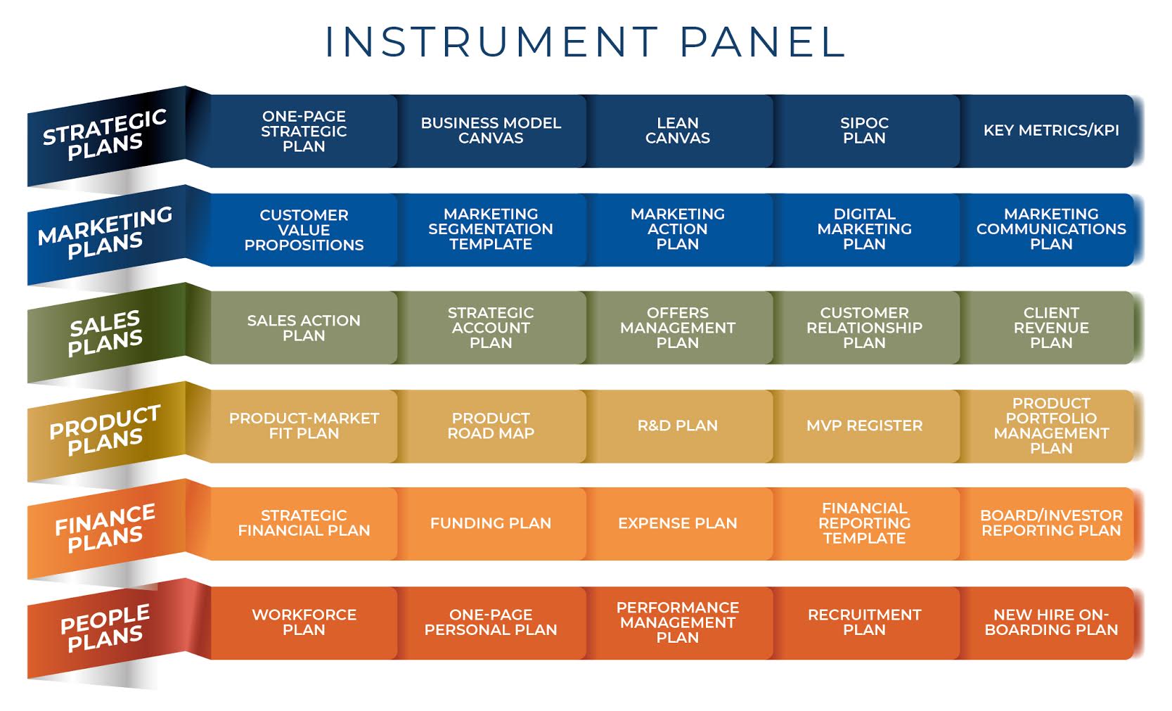 Our strategic tool box includes a range of instruments and templates across six key business functions – strategic planning, marketing plans, sales plans, product plans, financial plans and people plans. Implementing these plans in structured way allows our clients to scale their business efficiently by streamlining processes, maximising automation and minimising overheads.